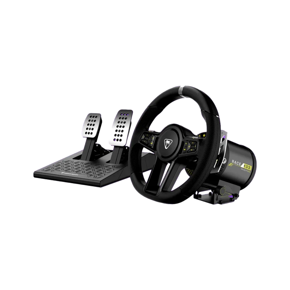 ערכת VelocityOne™ Race KD3 מבית Turtle Beach מציעה חוויית מרוצים אותנטית ומלאה עבור Xbox ו-PC. ההגה כולל מנוע הנעה ישירה עם משוב כוח עוצמתי, ידיות הילוכים מגנטיות וחומרים עמידים ברמת מרוצים. בנוסף, מכלול דוושות מצערת ובלם הניתן להתאמה אישית מבטיח שליטה מדויקת ונוחות מירבית.
