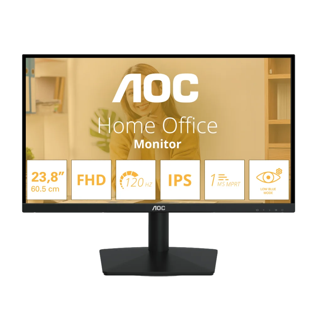 מסך בגודל 23.8″ מבית AOC, עם רזולוציית Full HD, קצב רענון של 120Hz וזמן תגובה של 1ms. כולל פאנל IPS איכותי וזוויות צפייה רחבות, טכנולוגיית Adaptive-Sync להפחתת קריעת תמונה, וטכנולוגיית Flicker-Free להפחתת עייפות העיניים. פתרון מושלם לשילוב עבודה, לימודים ומשחק.