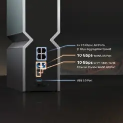 שני חיבורי 10Gbps – אחד קומבו Ethernet/Fiber, השני LAN/WAN רגיל – לצד 4× יציאות 2.5Gbps