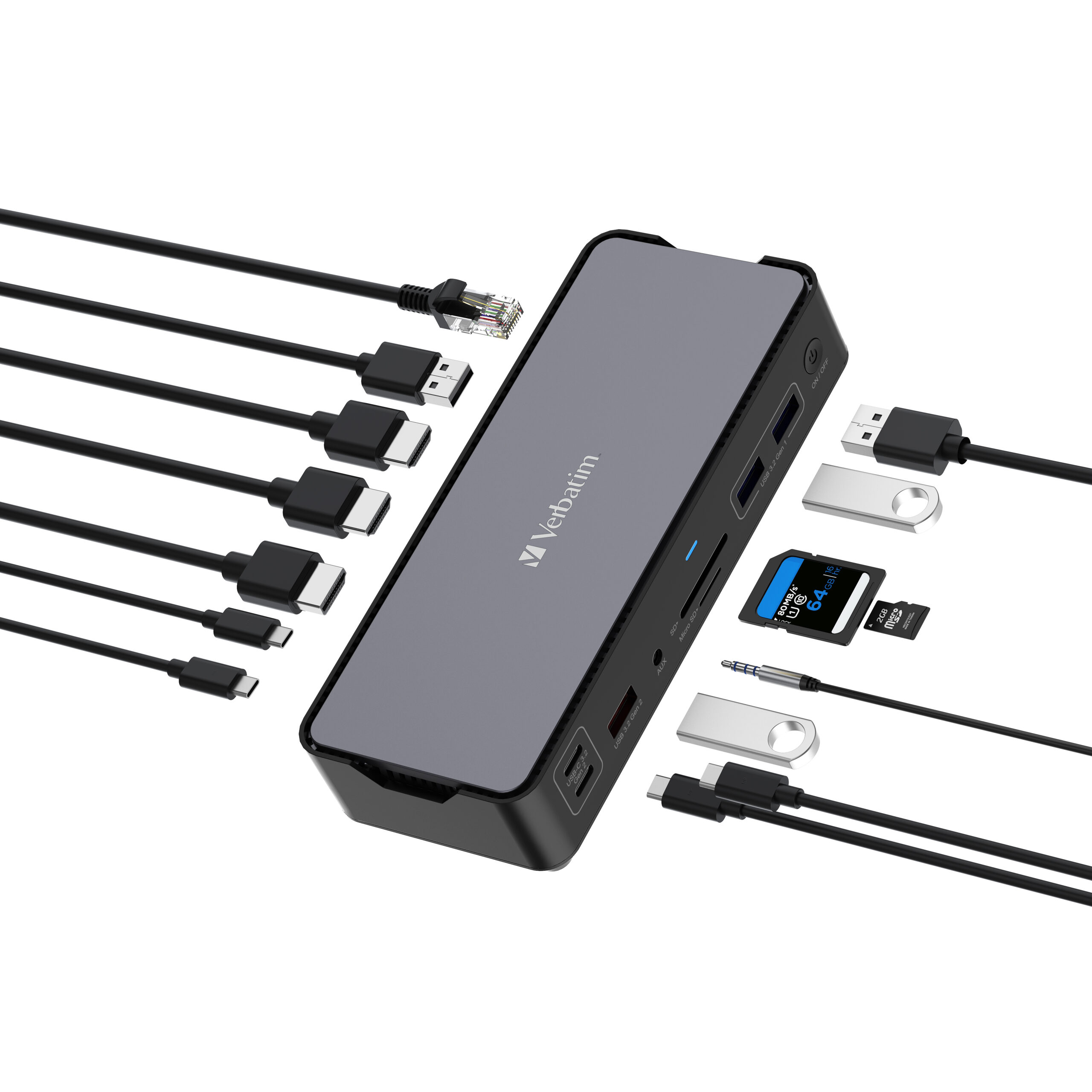 2 x HDMI, up to 8K@30Hz; 1 x DP, up to 8K@30Hz; 1 x RJ45, up to 1Gbs; 1 x USB-A 3.1, up to 10Gbs; 2 x USB-A 3.0, up to 5Gbs; 1 x USB-A 2.0, up to 480Mbs; 2 x USB-C 3.1, up to 10Gbs; 1 x SD 4.0; 1 x Micro SD 3.0; 1 x Audio jack; 1 x USB-C Host ; 1 x USB-C PD, up to 100W
